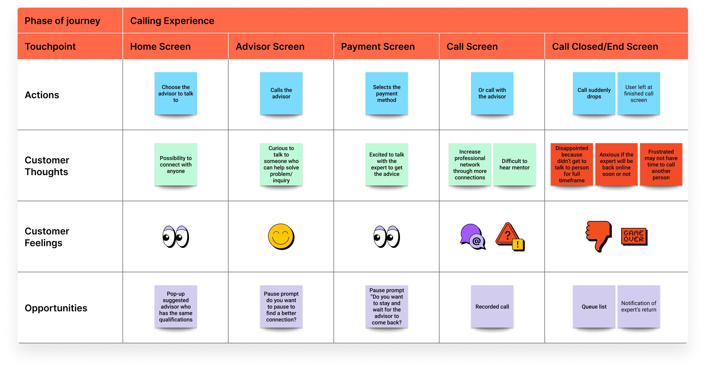 Examining the user journey of a call with a mentor helped understand and uncover users pain points. The major pain point during the call was the user can experience connection disruptions and unexpected call hangups.
